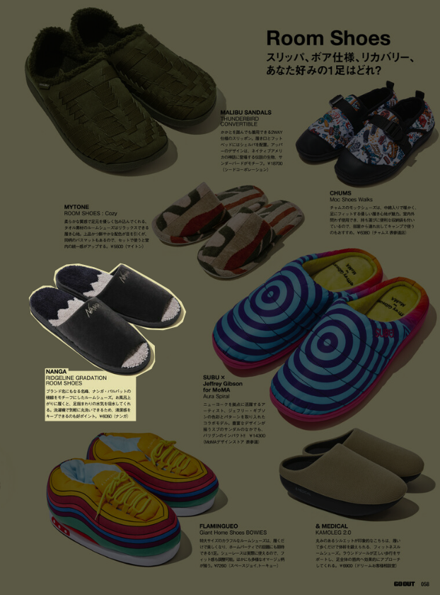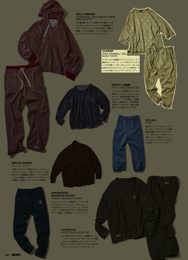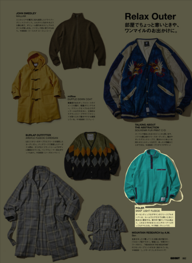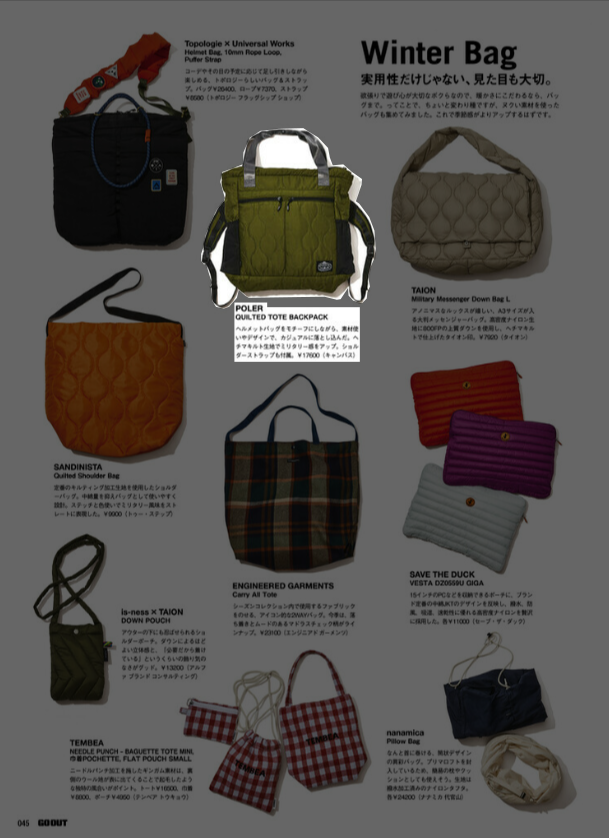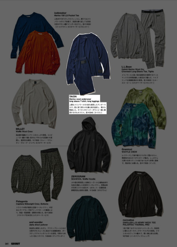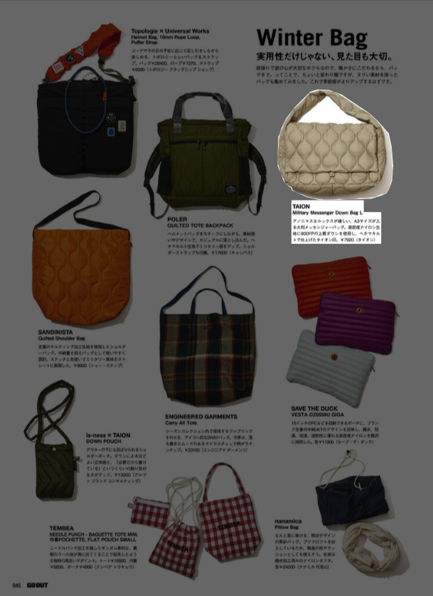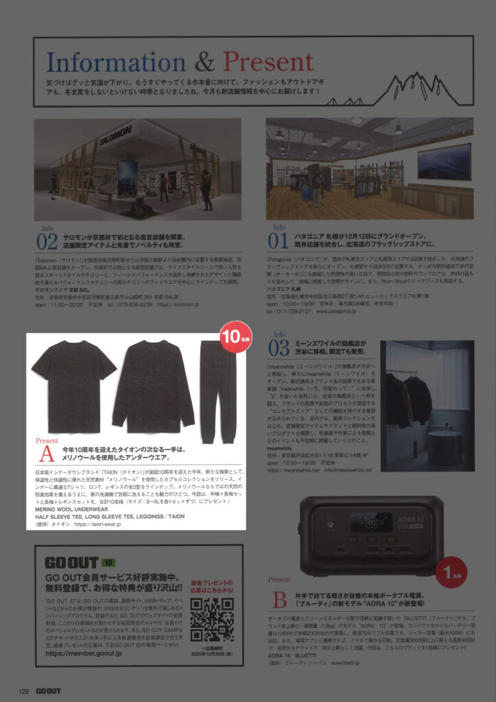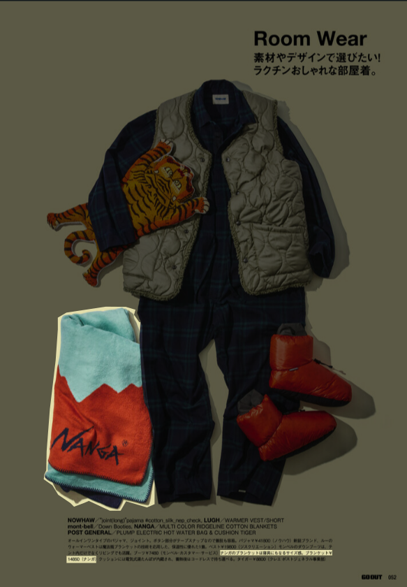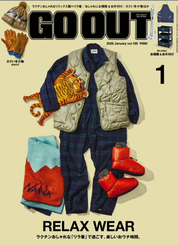 『GO OUT』1月号 2025.11.29 Sat - Published 掲出ブランド DAIWAFoxFireGOHEMPGRIP SWANYNANGAPOLERTAION GRIP SWANY, GOHEMP, TAION, POLER, NANGA, Foxfire, DAIWA 『GO OUT』1月号 GRIP SWANY GOHEMP TAION【TAIONメリノウール】 TAION【ミリタリー メッセンジャー ダウンバッグL】 POLER【QUILTED TOTE BACKPACK】 NANGA【NANGA PARBAT WINTER SANDAL】 NANGA【フレームレジスタントロゴブランケット】 GOHEMP【WIDE BASEBALL TEE&MUSA PANTS】 NANGA【NANGA RIDGELINE GRADATION ROOM SHOES】 POLER【SNAP LIGHT FLEECE】 Foxfire【KTLフリースブランケット】 NANGA【エイシェントフィッシュコットンブランケット シングル】 GRIP SWANY TAION【メリノウール】 DAIWA TAION【メリノウール】 NEWS PRESS 掲出ブランド DAIWAFoxFireGOHEMPGRIP SWANYNANGAPOLERTAION
