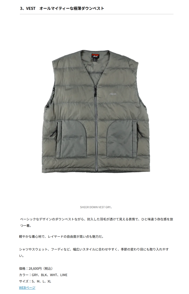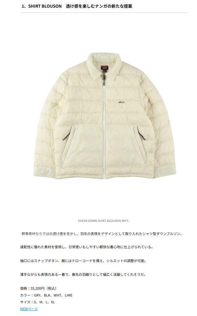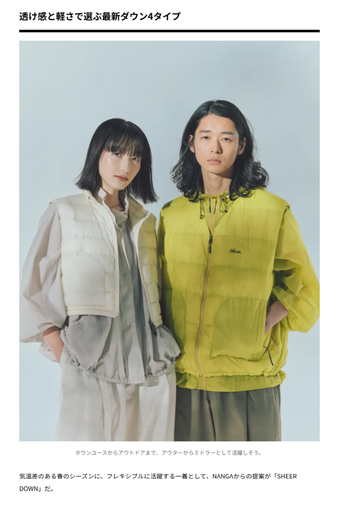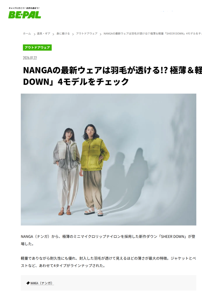 BE-PAL 2026.01.20 Tue - Posted 掲出ブランド NANGA NANGA BE-PAL NANGA【SHEEDシリーズ】 NANGA【SHEER DOWN SHIRT BLOUSON】 NANGA【SHEER DOWN JKT W】 NANGA【SHEER DOWN VEST】 NANGA【SHEER DOWN VEST W 】 NANGA【SOFT DOWN COACH JKT 】 NEWS PRESS 掲出ブランド NANGA