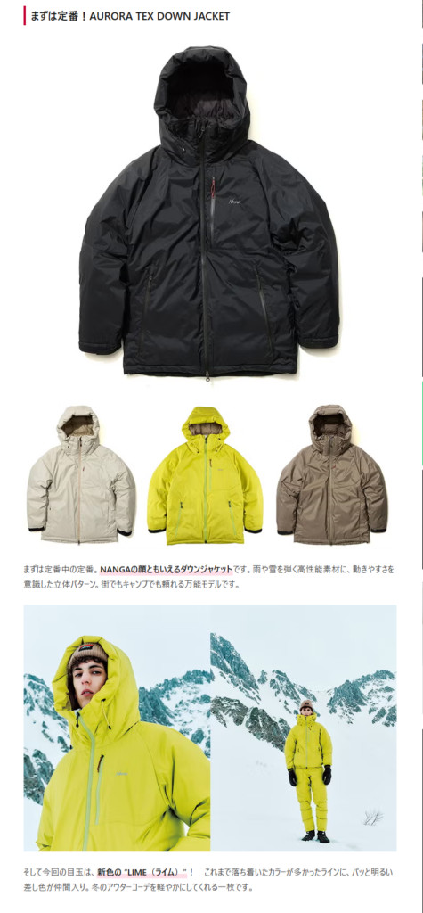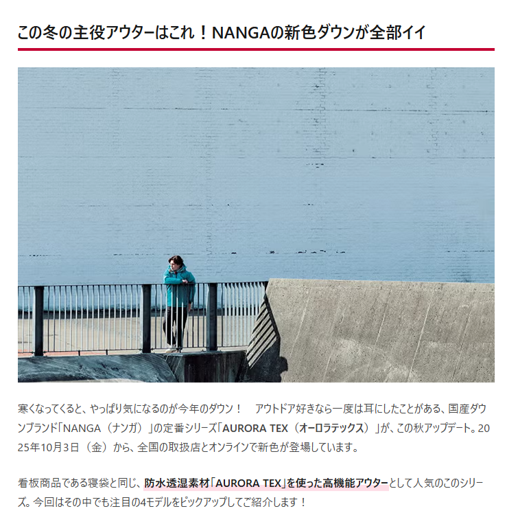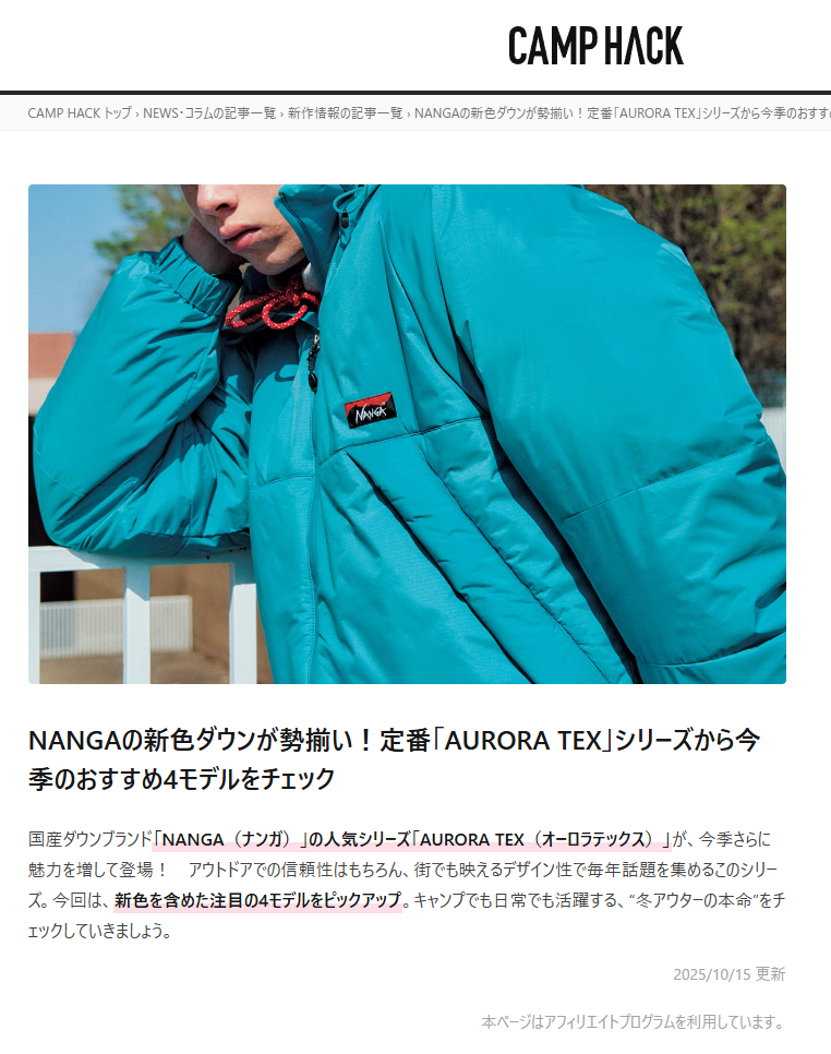CAMP HACK 2025.10.15 Wed - Posted 掲出ブランド NANGA NANGA CAMP HACK NANGA NANGA【オーロラテックス ダウンジャケット】 NANGA【オーロラテックス ダウンフィールドハーフコート】 NANGA【オーロラテックス ダウンジャケット イブキ】 NANGA【オーロラテックスライト ダウンジャケット ミカミ】 NANGA NEWS PRESS 掲出ブランド NANGA