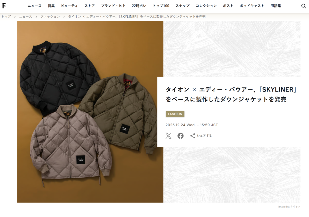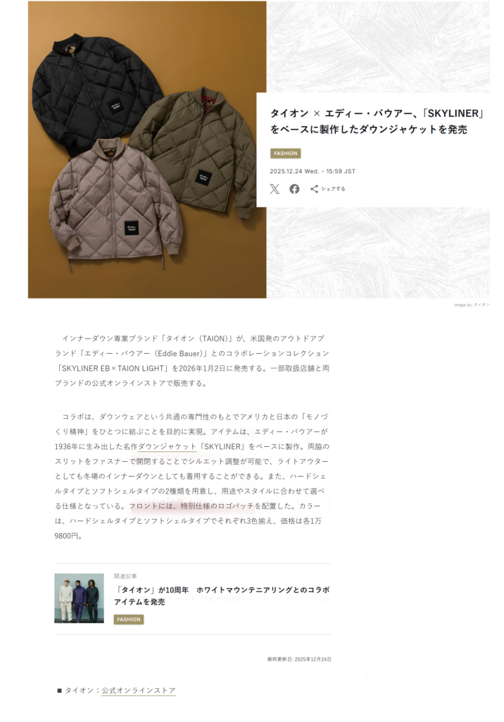 Fashion Snap 2025.12.24 Wed - Posted 掲出ブランド TAION TAION Fashion Snap TAION【Eddie Bauer×TAION】 NEWS PRESS 掲出ブランド TAION
