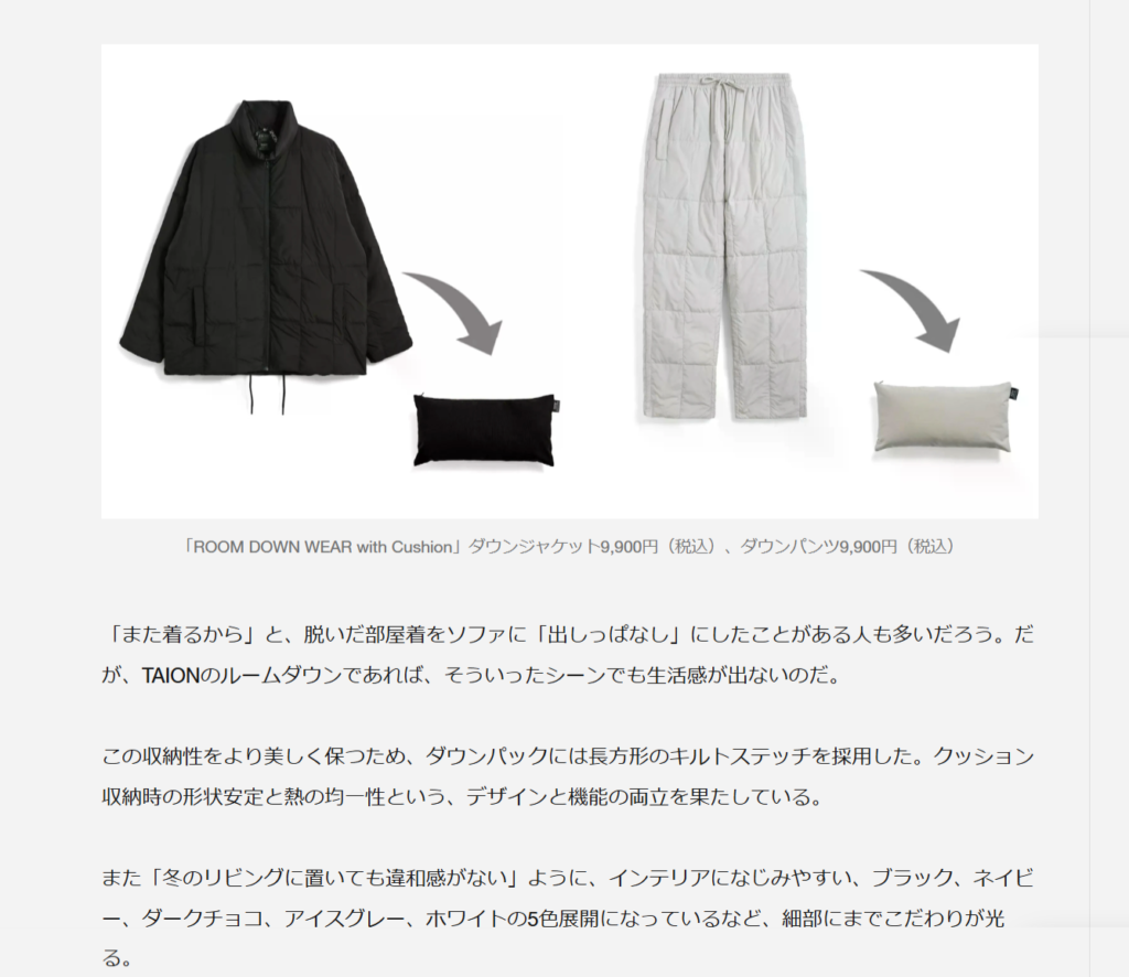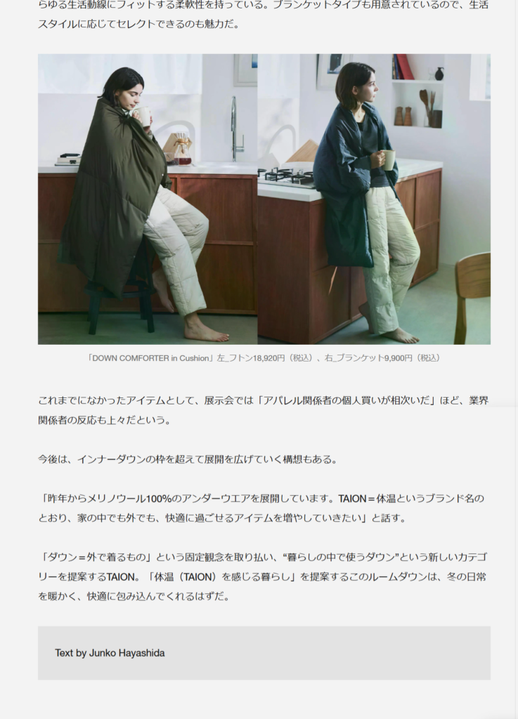 Fashion Tech News 2026.01.06 Tue - Posted 掲出ブランド TAION TAION Fashion Tech News TAION【ルームダウンシリーズ】 TAION【ルームダウンシリーズ】 TAION【ルームダウンシリーズ】 TAION【ルームダウンシリーズ】 TAION【ルームダウンシリーズ】 NEWS PRESS 掲出ブランド TAION