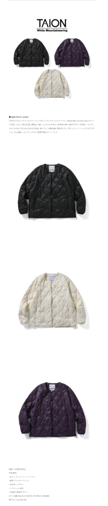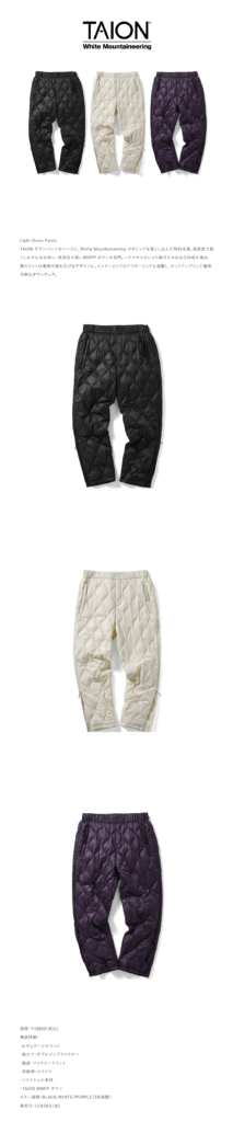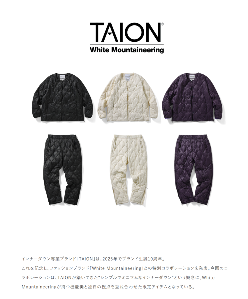 FLY MAGAZINE 2025.11.28 Fri - Posted 掲出ブランド TAION TAION FLY MAGAZINE TAION×White Mountaineering TAION×White Mountaineering TAION×White Mountaineering TAION×White Mountaineering【Light Down Jacket】 TAION×White Mountaineering【Light Down Pants】 TAION×White Mountaineering TAION×White Mountaineering NEWS PRESS 掲出ブランド TAION