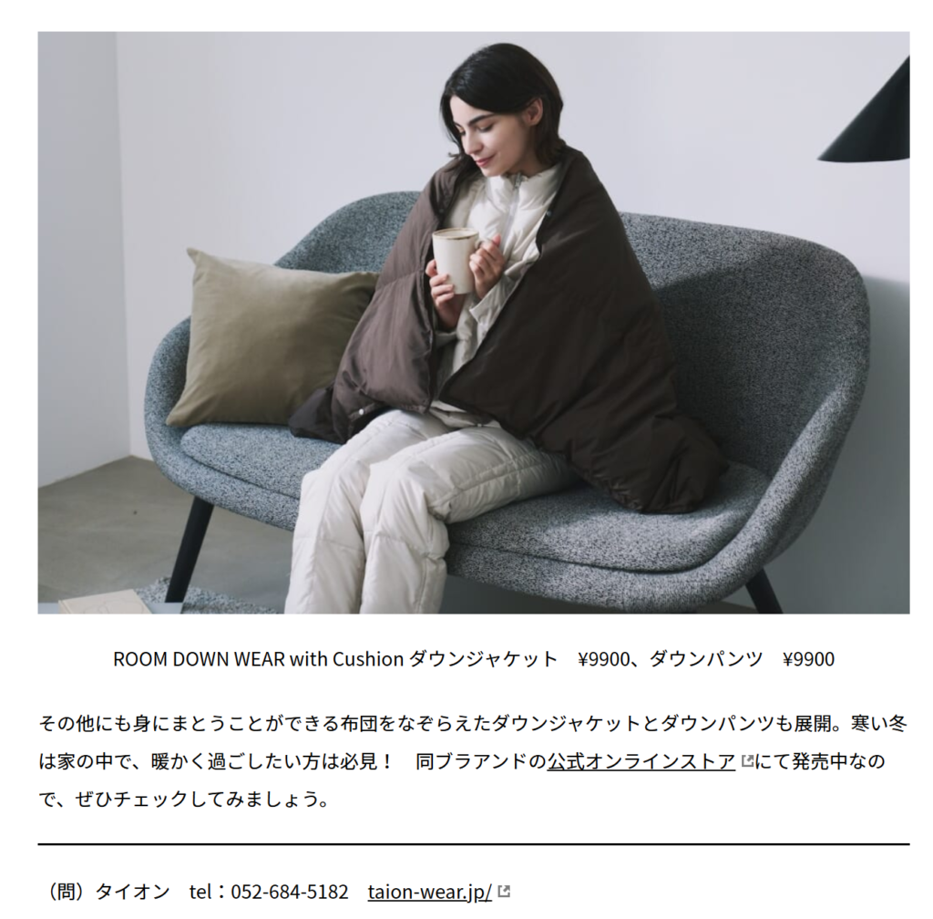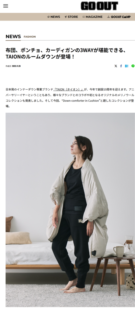 GO OUT WEB 2025.11.28 Fri - Posted 掲出ブランド TAION TAION GO OUT WEB TAION【ルームダウン】 TAION【ルームダウン】 TAION【ルームダウン】 NEWS PRESS 掲出ブランド TAION