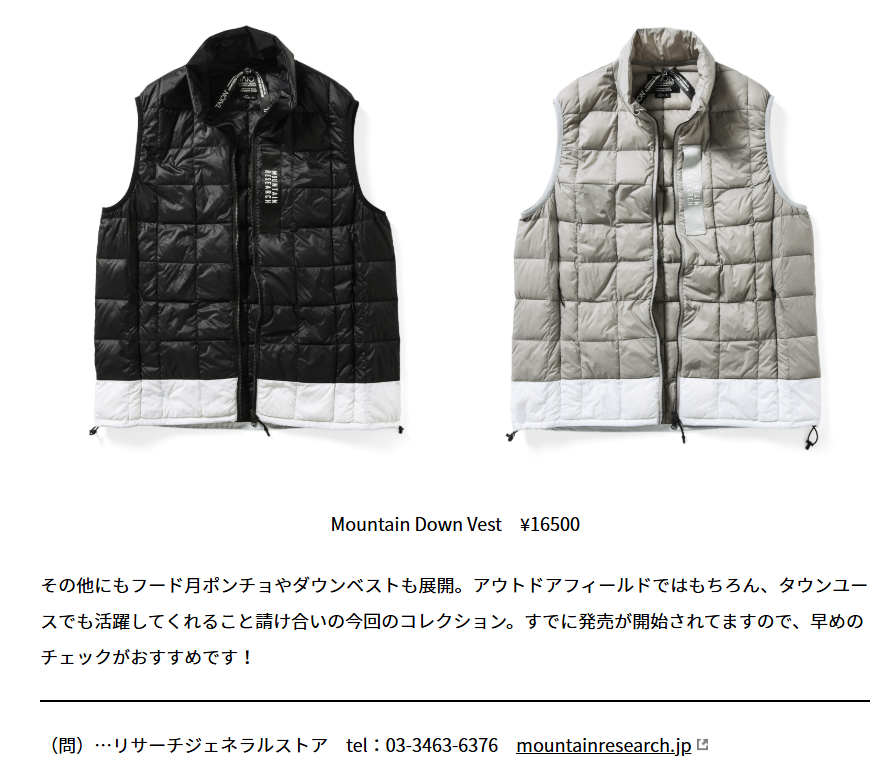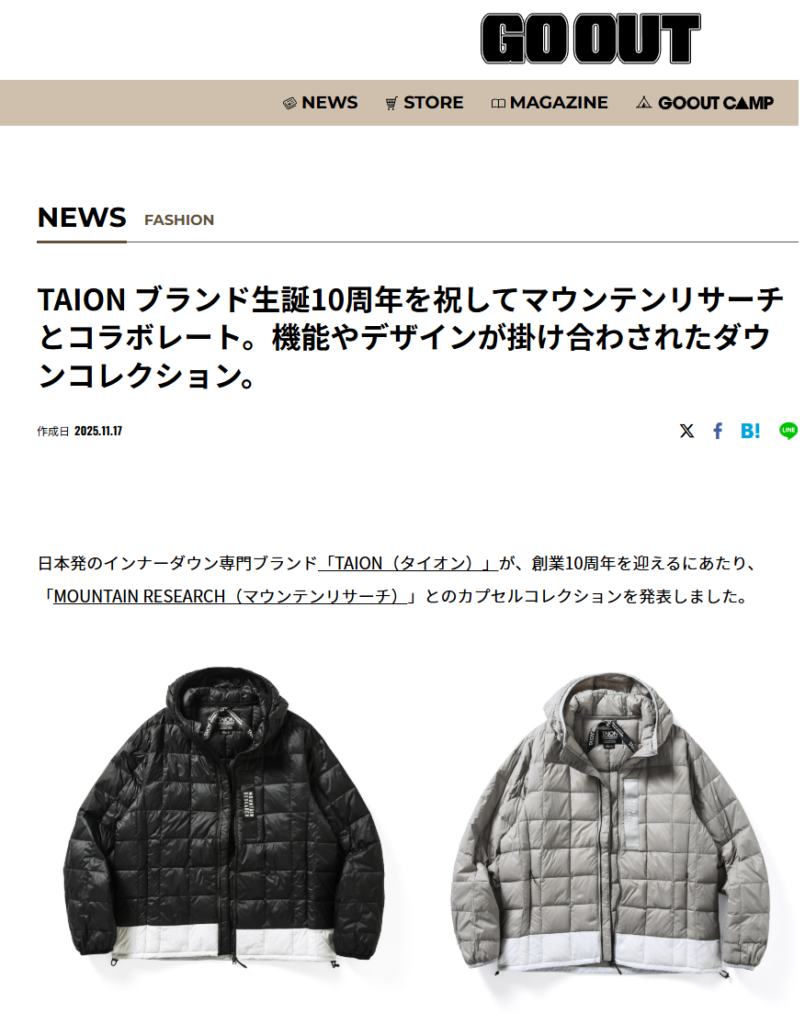 GO OUT WEB 2025.11.17 Mon - Posted 掲出ブランド TAION TAION GO OUT WEB TAION×MOUNTAIN RESEARCH【Mountain Down Coach Shirt】 TAION×MOUNTAIN RESEARCH【Mountain Down Poncho】 TAION×MOUNTAIN RESEARCH【Mountain Down Vest】 NEWS PRESS 掲出ブランド TAION