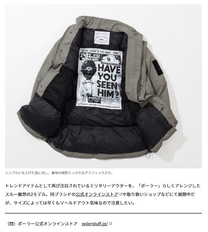 GO OUT WEB 2025.12.13 Sat - Posted 掲出ブランド POLER POLER GO OUT WEB POLER【MONSTER STUFF PARKA】 POLER【MONSTER STUFF PARKA】 NEWS PRESS 掲出ブランド POLER