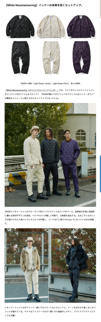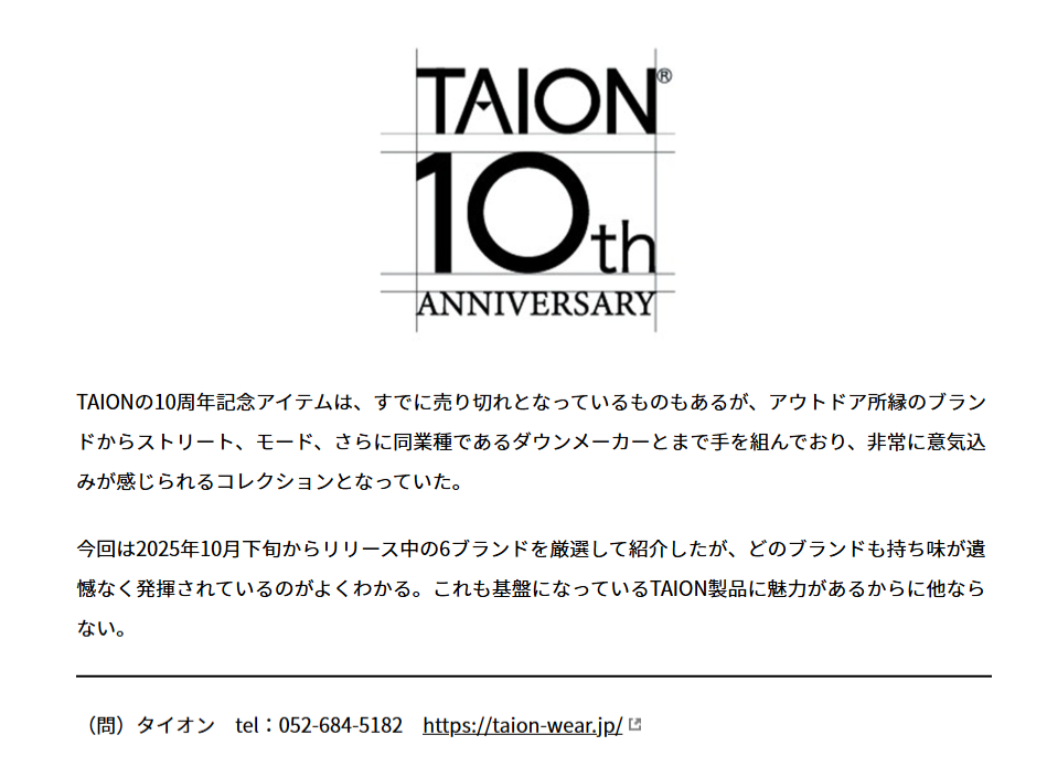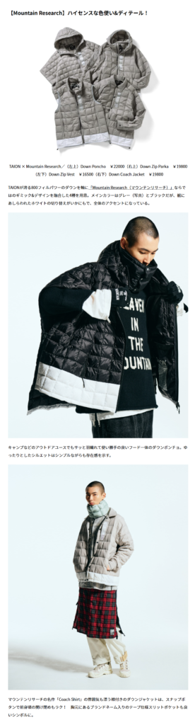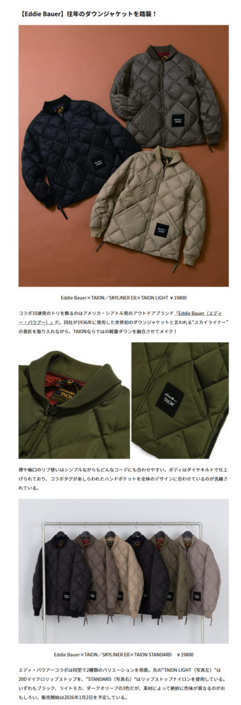 GO OUT WEB 2025.12.15 Mon - Posted 掲出ブランド TAION TAION GO OUT WEB TAION × Mountain Research TAION×White Mountaineering TAION×GRIP SWANY TAION×Universal Works S’YTE×TAION Eddie Bauer×TAION TAION NEWS PRESS 掲出ブランド TAION