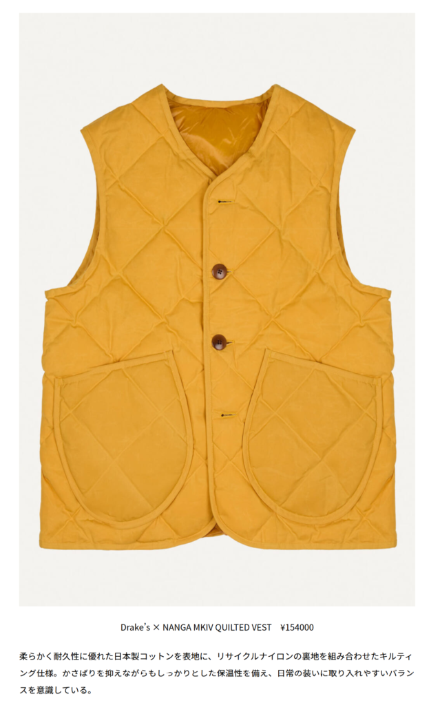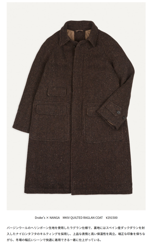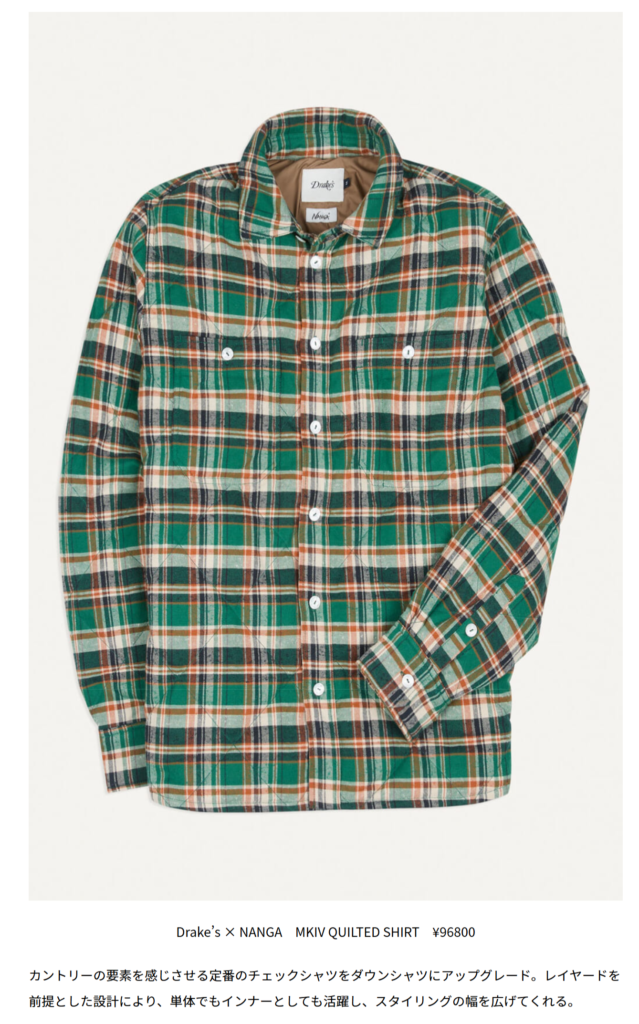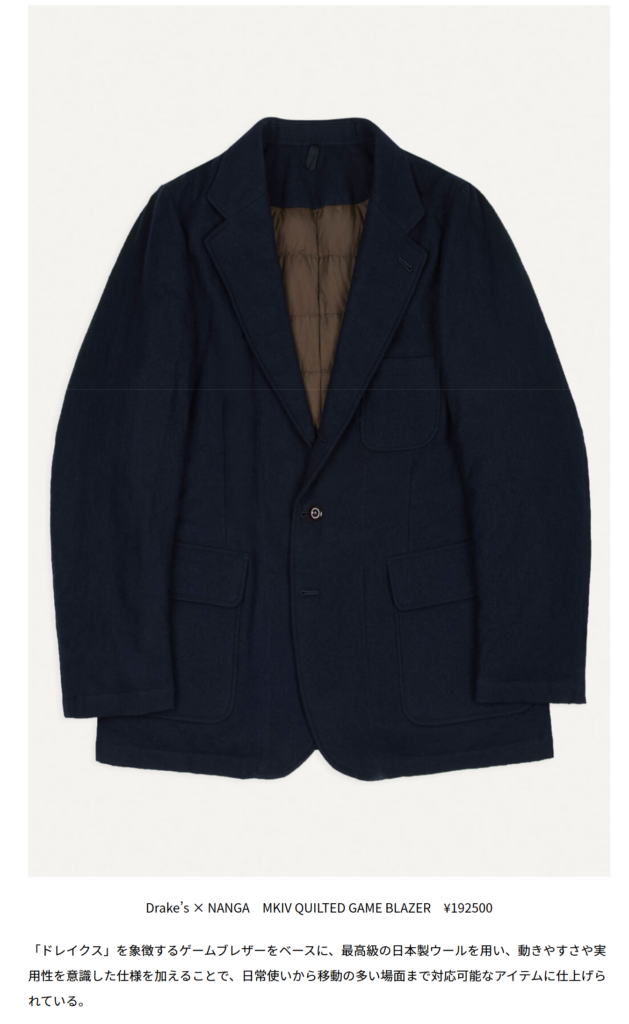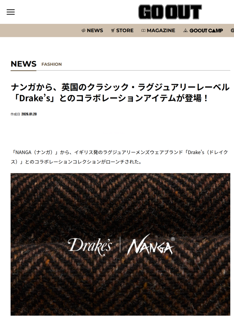 GO OUT WEB 2026.01.20 Tue - Posted 掲出ブランド NANGA NANGA GO OUT WEB Drake’s x NANGA【MKIV QUILTED RAGLAN COAT】 Drake’s × NANGA 【MKIV QUILTED GAME BLAZER】 Drake’s × NANGA 【MKIV QUILTED SHIRT】 Drake’s × NANGA 【MKIV QUILTED VEST】 Drake’s × NANGA 【QUILTED SCARF】 Drake’s × NANGA NEWS PRESS 掲出ブランド NANGA