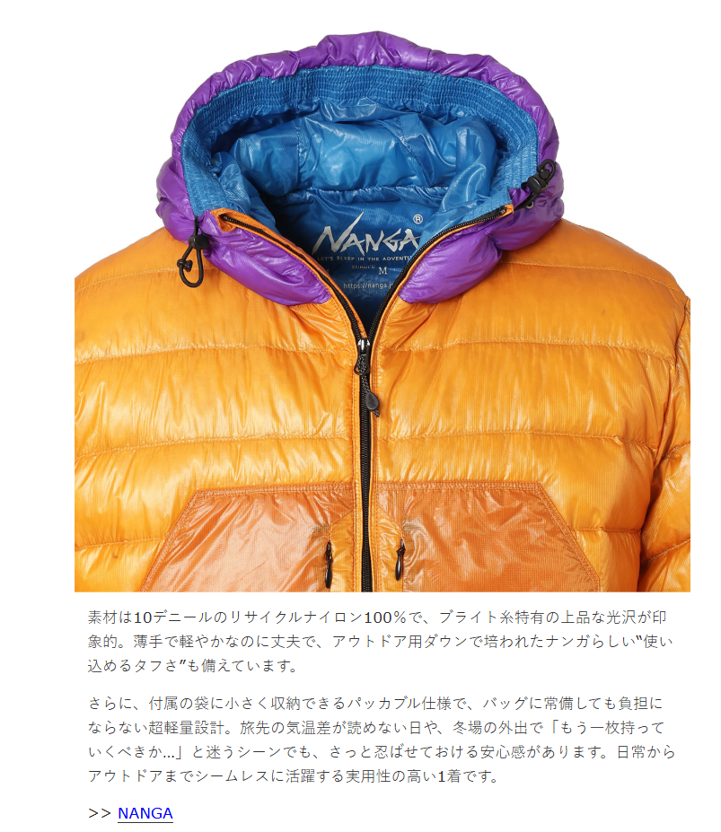 Goods Press 2025.12.09 Tue - Posted 掲出ブランド NANGA NANGA Goods Press NANGA【アルティライト ダウンパーカ パッカブル】 NANGA【アルティライト ダウンパーカ パッカブル】 NEWS PRESS 掲出ブランド NANGA