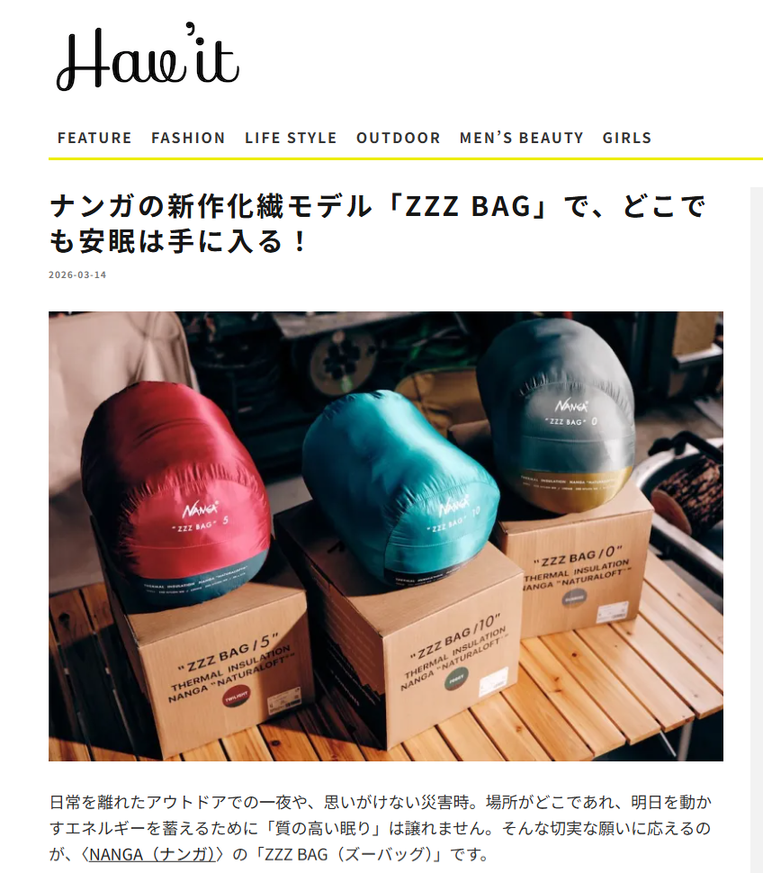 Havit magazine 2026.03.14 Sat - Posted 掲出ブランド NANGA NANGA Havit magazine NANGA【ZZZ BAG 10】 NANGA【ZZZ BAG 5】 NANGA【ZZZ BAG 0】 NANGA【ZZZ BAG】 NANGA【ZZZ BAG】 NEWS PRESS 掲出ブランド NANGA