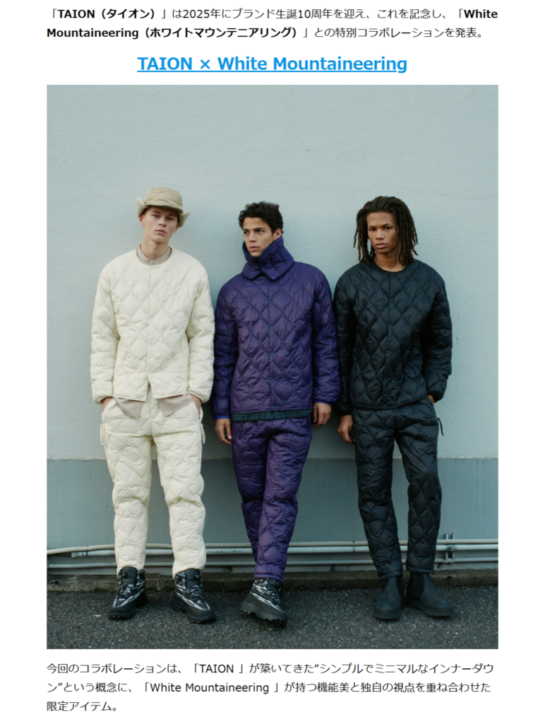 MEN’S NON-NO WEB 2025.11.28 Fri - Posted 掲出ブランド TAION TAION MEN’S NON-NO WEB TAION×White Mountaineering TAION×White Mountaineering【White Mountaineering×TAION 10周年コラボダウンジャケット】 TAION×White Mountaineering【White Mountaineering×TAION 10周年コラボダウンパンツ】 NEWS PRESS 掲出ブランド TAION