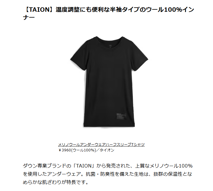 mi-molette 2025.10.29 Wed - Posted 掲出ブランド TAION TAION mi-molette TAION【メリノウール アンダーウェア ハーフスリーブ Tシャツ】 TAION【メリノウール アンダーウェア ハーフスリーブ Tシャツ】 NEWS PRESS 掲出ブランド TAION