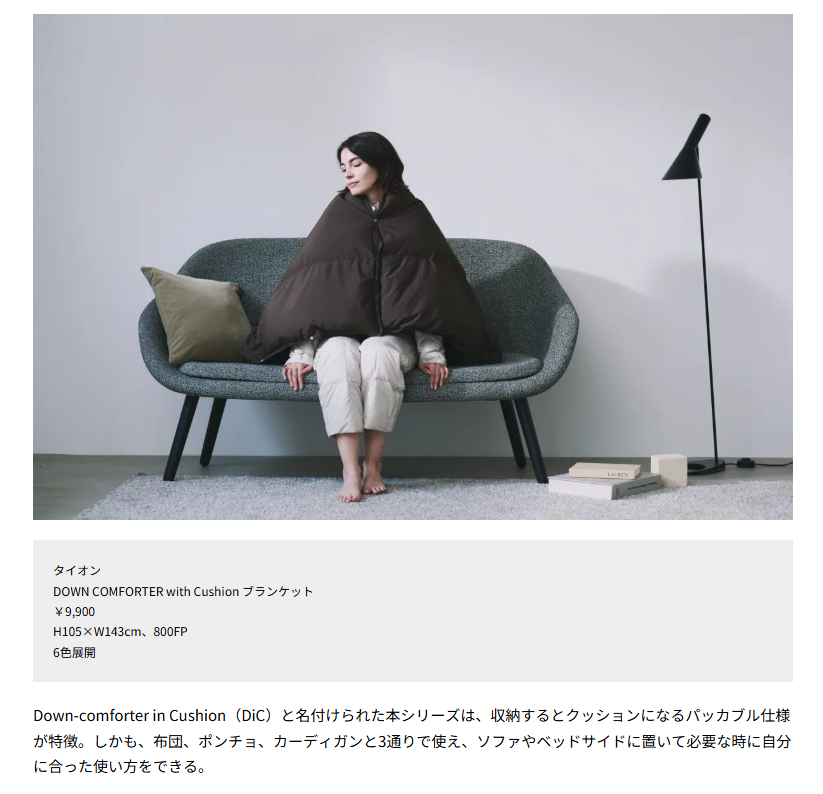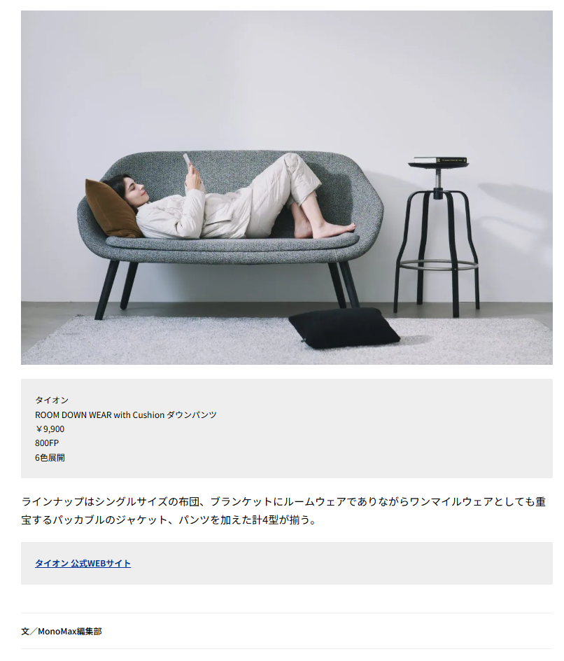 MonoMax WEB 2025.12.08 Mon - Posted 掲出ブランド TAION TAION MonoMax WEB TAION【DOWN COMFORTER with Cushion フトン】 TAION【DOWN COMFORTER with Cushion ブランケット】 TAION【ROOM DOWN WEAR with Cushion ダウンジャケット】 TAION【ROOM DOWN WEAR with Cushion ダウンパンツ】 NEWS PRESS 掲出ブランド TAION