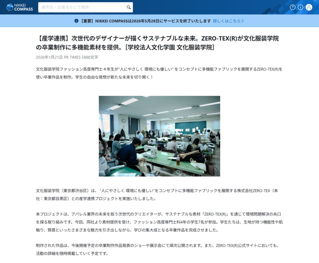 Nlkkei Combass 2026.01.20 Tue - Posted 掲出ブランド ZERO-TEX ZERO-TEX Nlkkei Combass ZERO-TEX×文化服装学院 ZERO-TEX×文化服装学院 ZERO-TEX 文化服装学院 NEWS PRESS 掲出ブランド ZERO-TEX