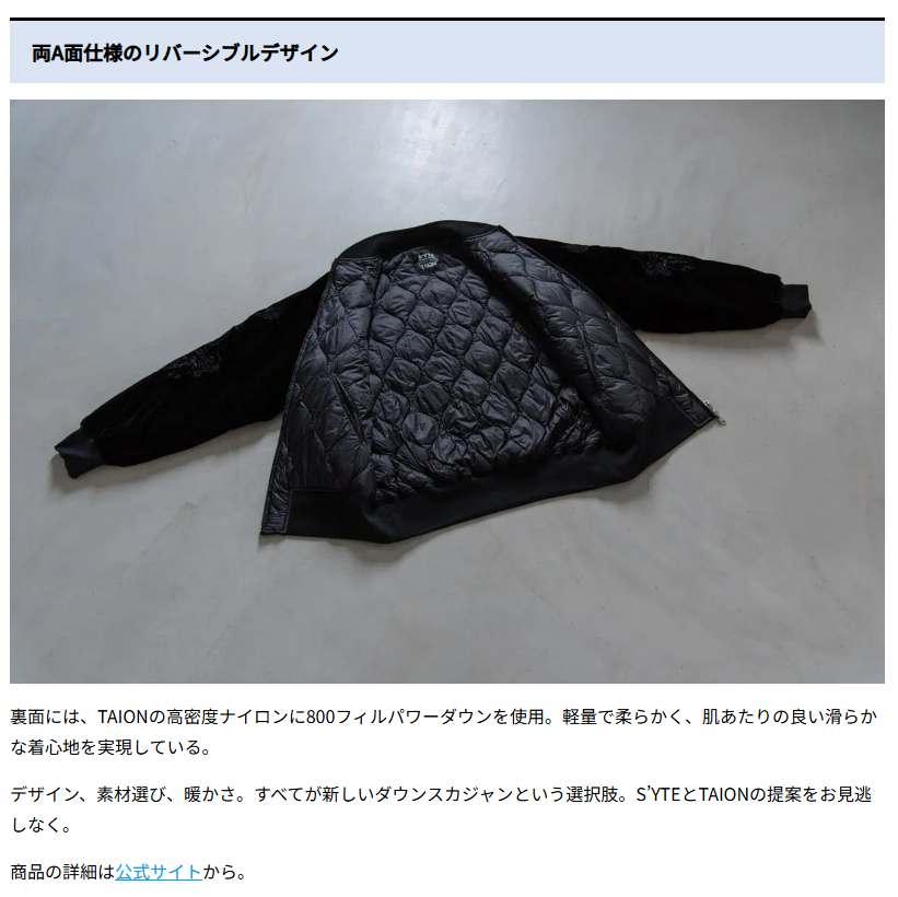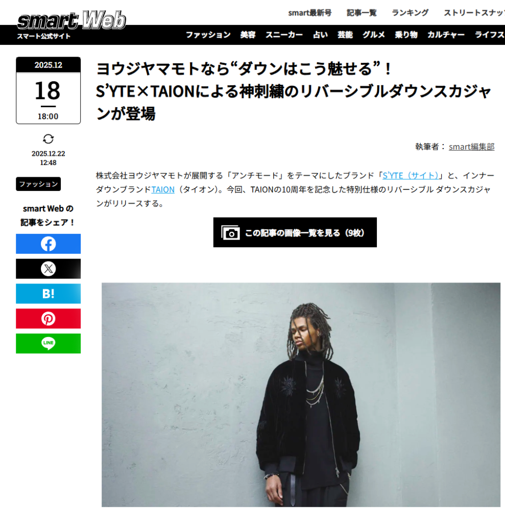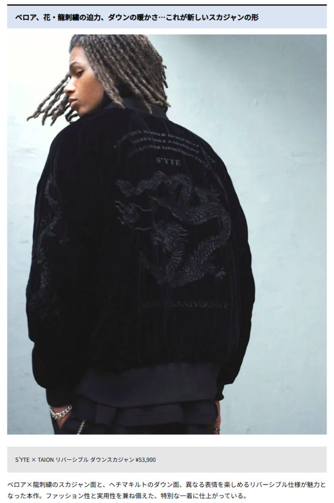 smart Web 2025.12.18 Thu - Posted 掲出ブランド TAION TAION smart Web S’YTE × TAION S’YTE × TAION【リバーシブル ダウンスカジャン】 S’YTE × TAION【リバーシブル ダウンスカジャン】 NEWS PRESS 掲出ブランド TAION