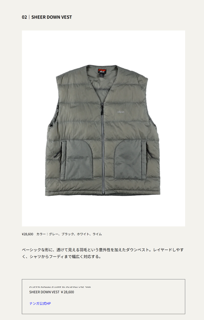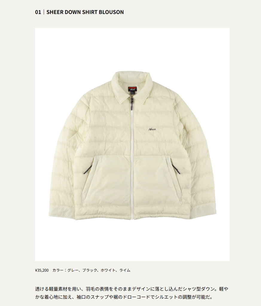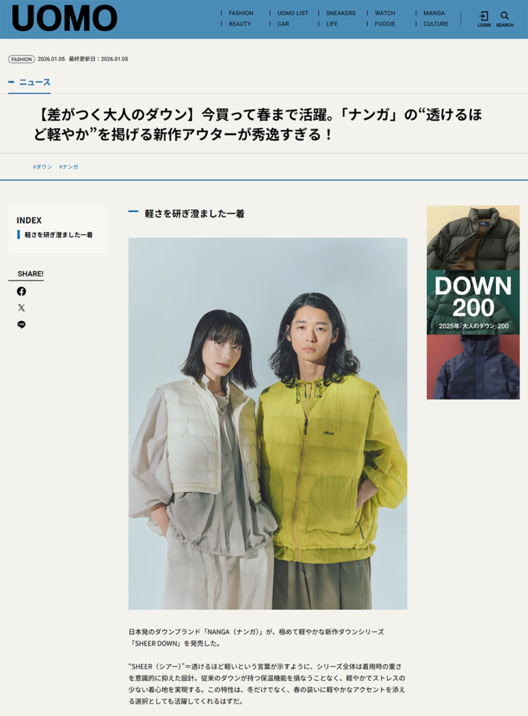 UOMO WEB 2026.01.05 Mon - Published 掲出ブランド NANGA NANGA UOMO WEB NANGA【シアーダウンシリーズ】 NANGA【シアーダウンシャツブルゾン】 NANGA【シアーダウンベスト】 NEWS PRESS 掲出ブランド NANGA