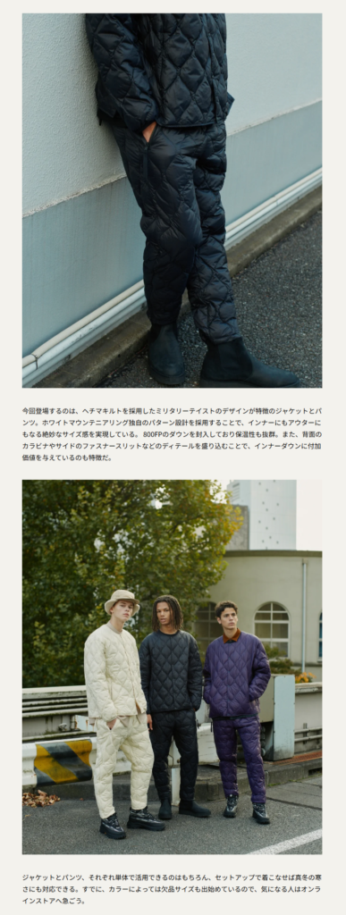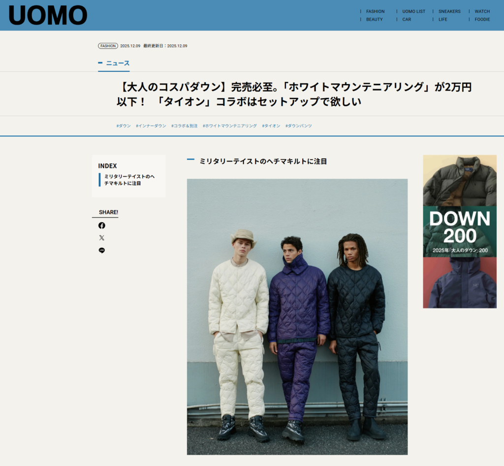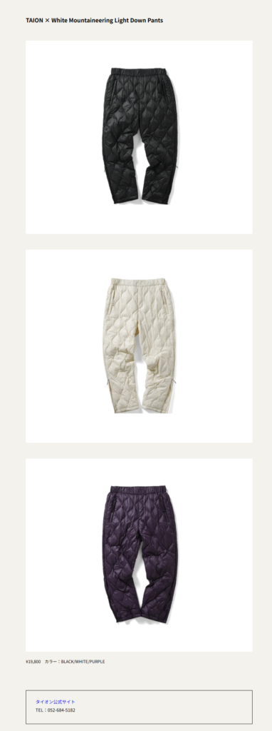 UOMO WEB 2025.12.09 Tue - Posted 掲出ブランド TAION TAION UOMO WEB TAION × White Mountaineering TAION × White Mountaineering 【Light Down Jacket】 TAION × White Mountaineering【Light Down Pants】 NEWS PRESS 掲出ブランド TAION