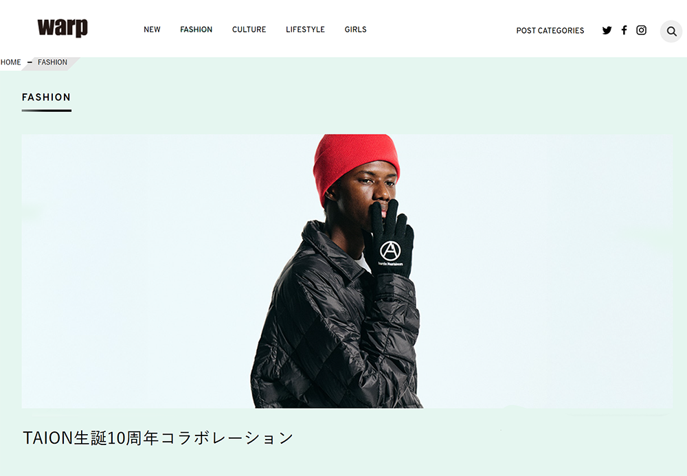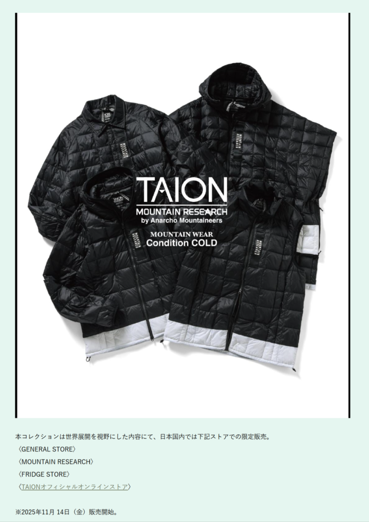 WARP WEB 2025.11.11 Tue - Posted 掲出ブランド TAION TAION WARP WEB TAION【TAION×MOUNTAIN RESEARCH】 TAION【TAION×MOUNTAIN RESEARCH】 TAION【TAION×MOUNTAIN RESEARCH】 TAION【TAION×MOUNTAIN RESEARCH】 NEWS PRESS 掲出ブランド TAION
